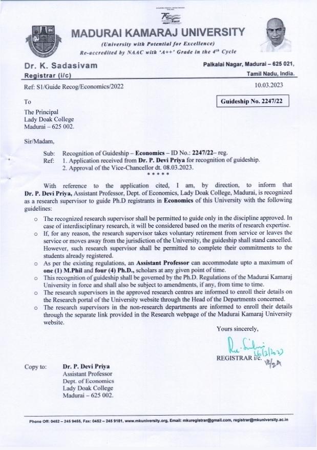 | 19 | Dr.P.Devi Priya,Assistant Professor | Department of Economics | 2247/22 | Economics |