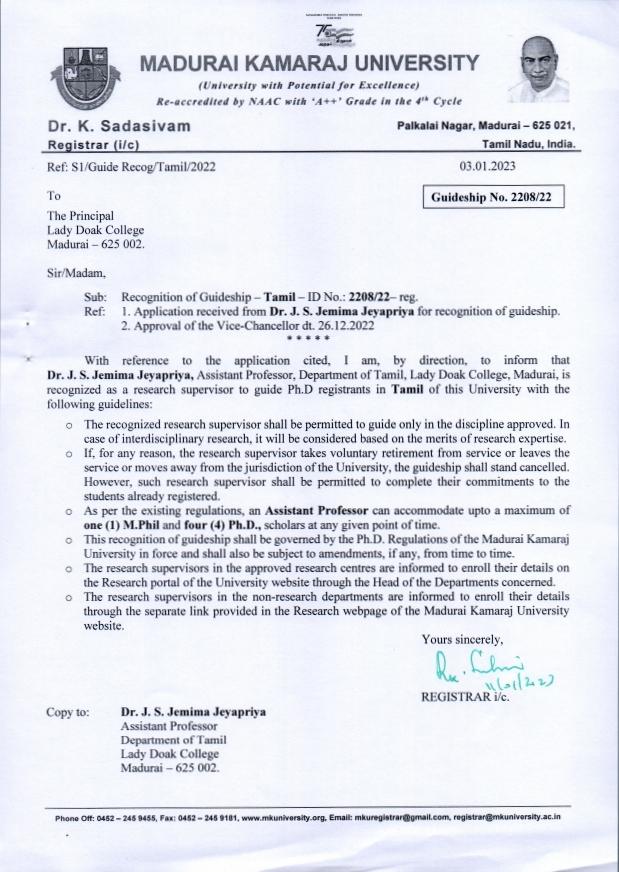| 7 | Dr.J.S.Jemima Jeyapriya,Assistant Professor | Department of Tamil | 2208/22 | Tamil |