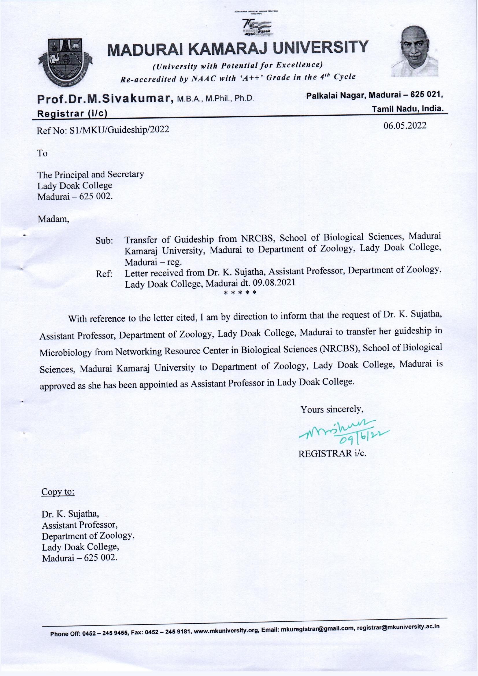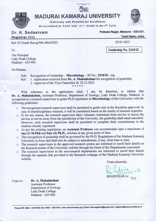 | 45 | Dr. Sujatha,Assistant Professor | Department of Zoology | S1/MKU/Guideship/2022 | Microbiology |