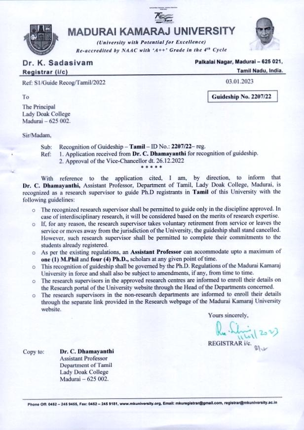 | 8 | Dr. C. Dhamayanthi,Assistant Professor | Department of Tamil | 2207/22 | Tamil |