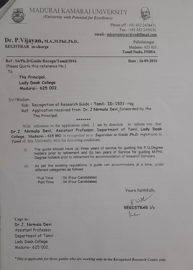 | 1 | Dr. A. Kavitharani, Associate Professor | Department of Tamil | 1559 | Tamil |