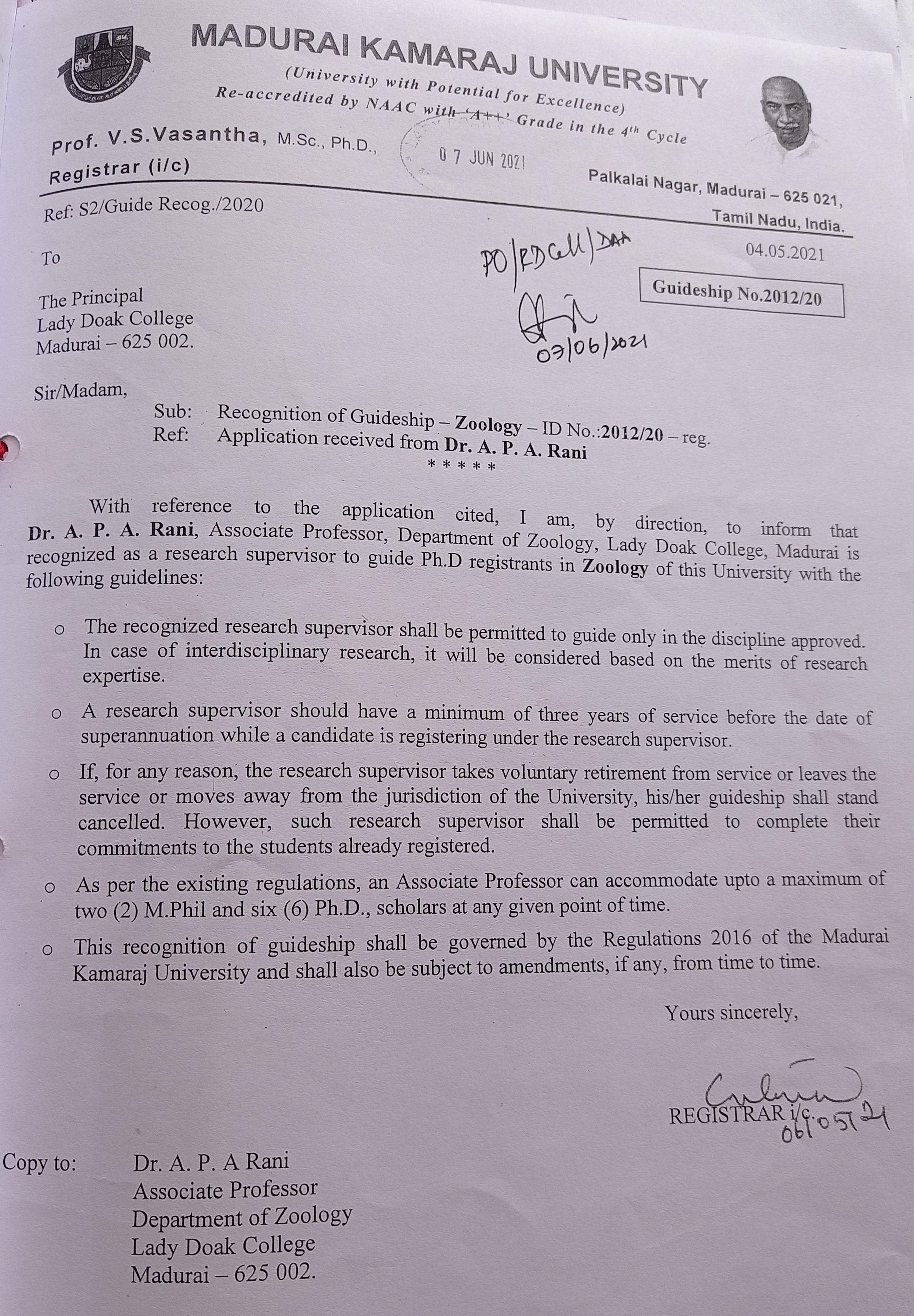 | 43 | Dr. A. P. A. Rani, Associate Professor | Department of Zoology | 2012/20 | Zoology |