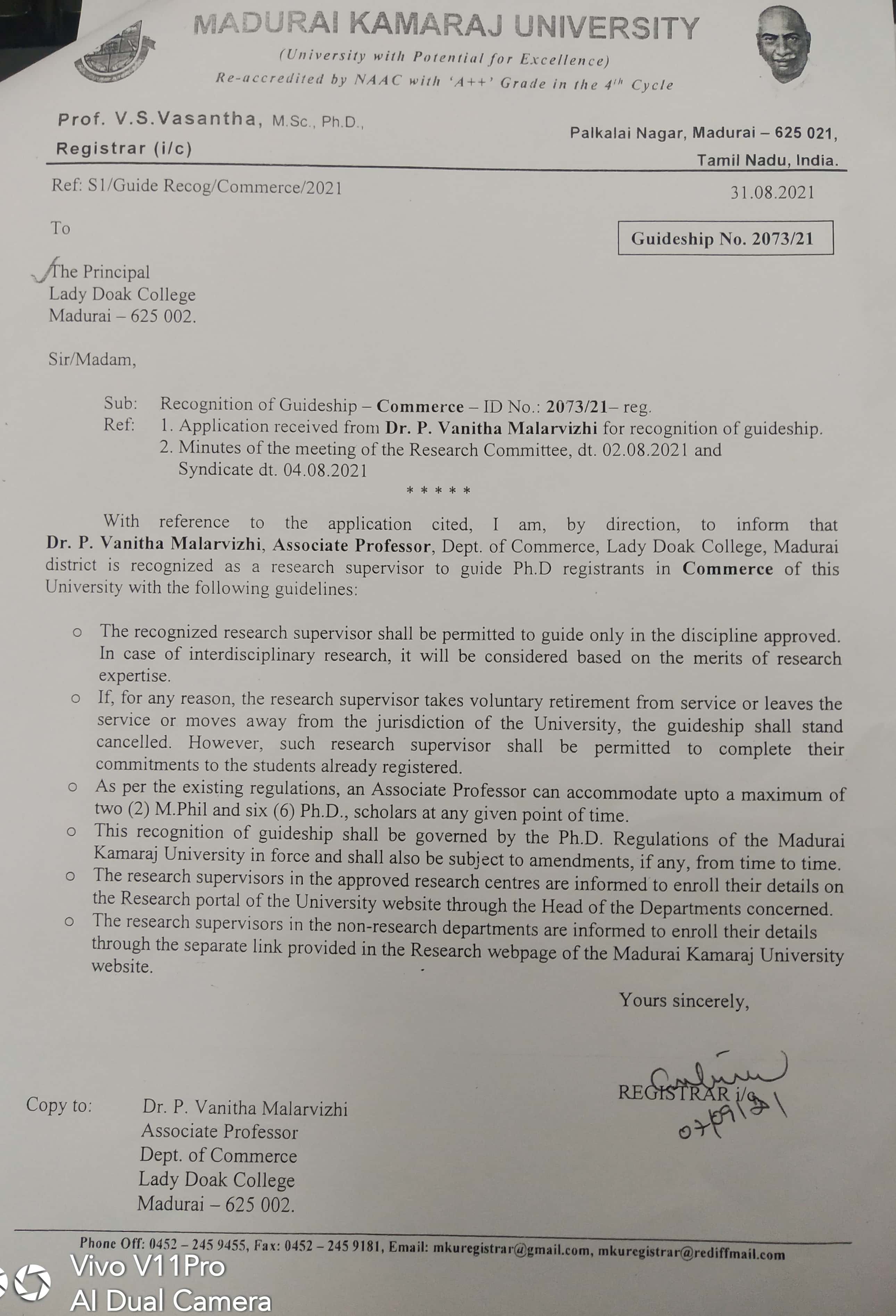 | 26 | Dr.Vanitha Malarvizhi, Associate Professor | Department of Commerce | 2073/21 | Commerce |